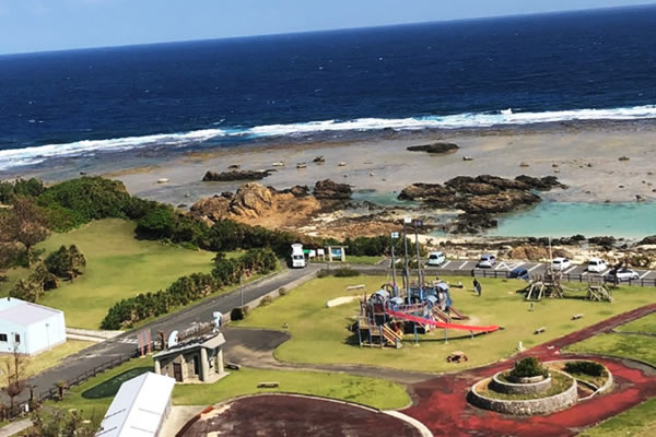 空港近くには、「あやまる岬」という珊瑚礁のリーフに囲まれた美しい岬があります。あやまるとは、手毬という意味で、半円の綺麗な形をした海岸です。そばにはあやまる岬観光公園があり、空港から10分と近く、奄美十景のひとつにもなっている人気のスポットです。展望台からは水平線が一望できる美しい景色を楽しむことができます。そのほか、子どもに人気の遊具広場、グラウンドゴルフもあり、大人も子供も楽しめる複合公園となっています。展望台の上の方には、あやまる岬観光案内所があり、その中には海を見ながらフードやドリンクが楽しめるみしょらんカフェがあります。